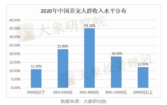 從2020年中國(guó)養(yǎng)寵人群收入水平分布數(shù)據(jù)來(lái)看,35.2%養(yǎng)寵人群收入在5001-8000元區(qū)間,22.9%養(yǎng)寵人群收入在3001-5000元區(qū)間,而收入?yún)^(qū)間3000元以下、8001-10000元、10000元以上的養(yǎng)寵人群占比相對(duì)較低,分別為:11.1%、18.5%、12.3%。可見(jiàn),大部分養(yǎng)寵人群的收入水平屬于中上等,養(yǎng)寵一定意義上彰顯了寵物主可觀的消費(fèi)潛力。