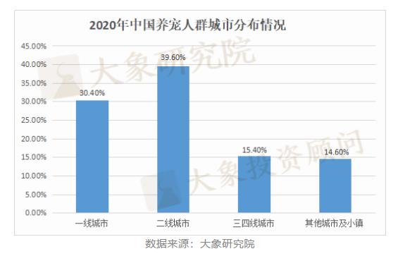 從城市分布來(lái)看,2020年中國(guó)養(yǎng)寵人群主要分布在一二線城市。其中,一線城市占比30.4%,二線城市占比30.4%,皆是寵物消費(fèi)的主力。三四線城市占比較小,為15.4%。與此同時(shí),國(guó)內(nèi)各城市也都保持著很高的寵物用品消費(fèi)增速,表明人們已不再滿足于單純的物質(zhì)消費(fèi),而是越來(lái)越注重生活品質(zhì)。