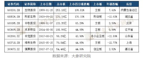 生物股份(主板)以市值253.18億元,成為7家上市公司中市值最高的企業(yè),市值最低的是佩蒂股份,為54.46億元。
