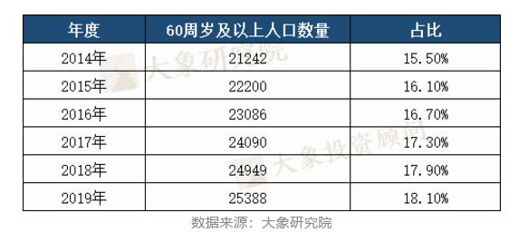 據(jù)大象研究院數(shù)據(jù)顯示,截至2019年年末,全國(guó)60周歲及以上人口為25388萬(wàn)人,占18.1%。