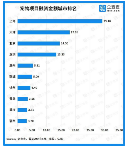 從城市分布來看,上海市作為兼顧奮斗與精致生活的發(fā)達(dá)城市,深得寵物賽道資本的青睞,融資金額遙遙領(lǐng)先,達(dá)29.18億元,其中一站式寵物服務(wù)項(xiàng)目波奇寵物、寵物醫(yī)療項(xiàng)目愛寵醫(yī)生等均落腳上海。天津、北京以及深圳的融資總金額同樣排名靠前。