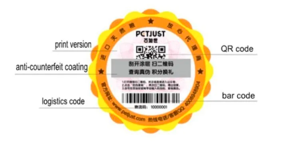 佩利安寵物食品包裝袋防偽標(biāo)簽含有物流碼、條形碼、二維碼、20 位隨機生成的防偽碼和百加世 聯(lián)系方式。