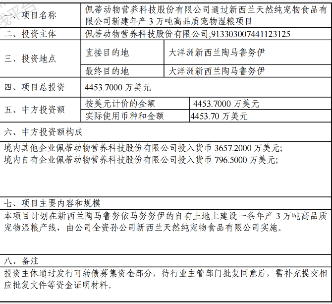 據(jù)公告信息指出,本次境外投資項目的投資主體為佩蒂動物營養(yǎng)科技股份有限公司,項目總投資額為4453.700萬美元(約合人民幣2.88億元),項目計劃在新西蘭陶馬魯努依馬努努伊的自有土地上建設(shè)一條年產(chǎn)3萬噸的高品質(zhì)寵物濕糧生產(chǎn)線,由佩蒂股份全資孫公司新西蘭天然純寵物食品有限公司實施。