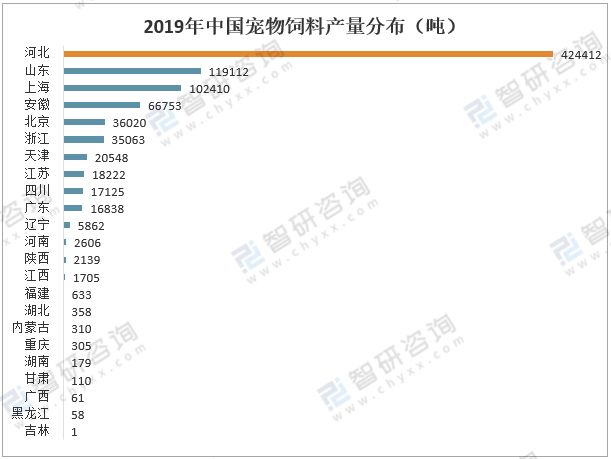 2019年中國寵物飼料產(chǎn)量分布(噸)