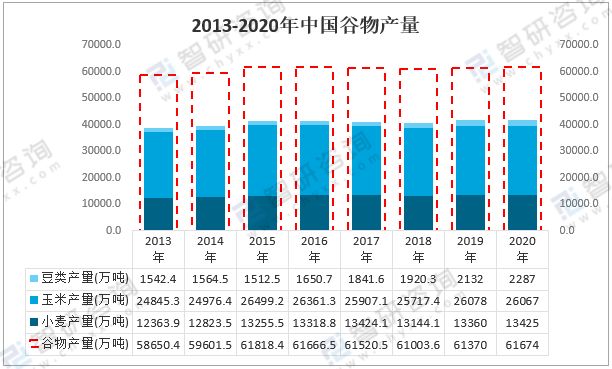 智研咨詢發(fā)布的《2022-2028年中國寵物飼料行業(yè)發(fā)展戰(zhàn)略規(guī)劃及投資方向研究報告》數(shù)據(jù)顯示:2020年中國谷物產(chǎn)量為61674萬噸,其中小麥產(chǎn)量為13425萬噸,玉米產(chǎn)量為26067萬噸,豆類產(chǎn)量為2287萬噸。