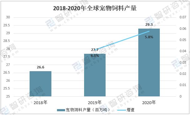 全球?qū)櫸锸袌鲆阎鸩匠墒?,寵物食品作為寵物行業(yè)的一個重要分支,是寵物市場最大的“蛋糕”,全球?qū)櫸锸称肥袌稣颊麄€寵物行業(yè)的比重逐年增加。2020年全球?qū)櫸镲暳袭a(chǎn)量為29.3百萬噸,較2019年的27.7百萬噸同比增長5.8%。
