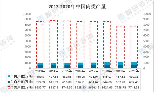 根據(jù)國家統(tǒng)計局:2020年中國肉類產(chǎn)量為7748.38萬噸,其中羊肉產(chǎn)量為492.31萬噸,牛肉產(chǎn)量為672.45萬噸。