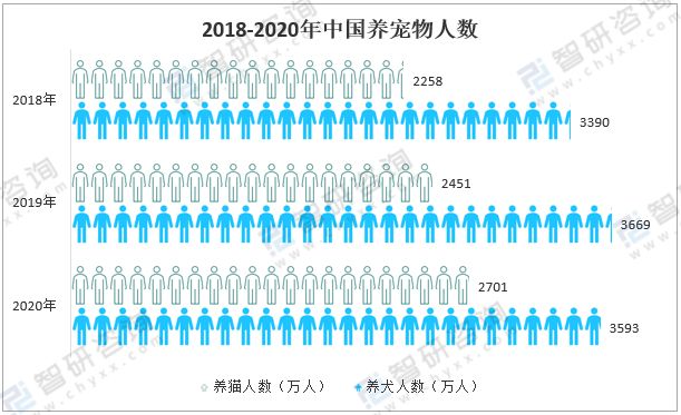近年來,隨著全球經(jīng)濟(jì)的快速發(fā)展和人們消費(fèi)觀念的不斷更新,我國寵物經(jīng)濟(jì)迅速崛起。其推動因素主要有兩方面:首先,受西方文化的影響,社會成員之間的聯(lián)系逐漸削弱,而“人口老齡化”和“勞動力流動”又促使孤獨(dú)群體越來越龐大,而寵物能起到心理治療和陪伴的作用。其次,隨著人們生活水平的不斷提升,絕大多數(shù)人能夠支付起養(yǎng)寵物的消費(fèi)支出。另外,“空巢青年”多分布于高薪職業(yè),具有較高的消費(fèi)能力,也是養(yǎng)寵物大軍的主體之一。2020年中國養(yǎng)貓人數(shù)為2701萬人,較2019年增加了250萬人;養(yǎng)犬人數(shù)為3593萬人,較2019年減少了76萬人。