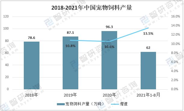 中國寵物食品行業(yè)興起于20世紀(jì)90年代,1993年瑪氏公司旗下著名狗糧品牌“寶路”和貓糧品牌“偉嘉”進(jìn)入中國,開啟了中國專業(yè)寵物食品市場。隨著中國寵物經(jīng)濟(jì)的崛起,寵物食品行業(yè)受到了越來越多的關(guān)注,寵物食品是保障寵物健康的基礎(chǔ),人們對寵物食品的追求逐漸與人類食品趨于一致,預(yù)防性和主動性健康措施已成為消費(fèi)者最看重的問題。近年來,中國寵物飼料行業(yè)產(chǎn)量及需求量不斷增加,根據(jù)中國飼料工業(yè)協(xié)會數(shù)據(jù):2021年1-8月中國寵物飼料產(chǎn)量為62萬噸,較上年同比增長13.5%。