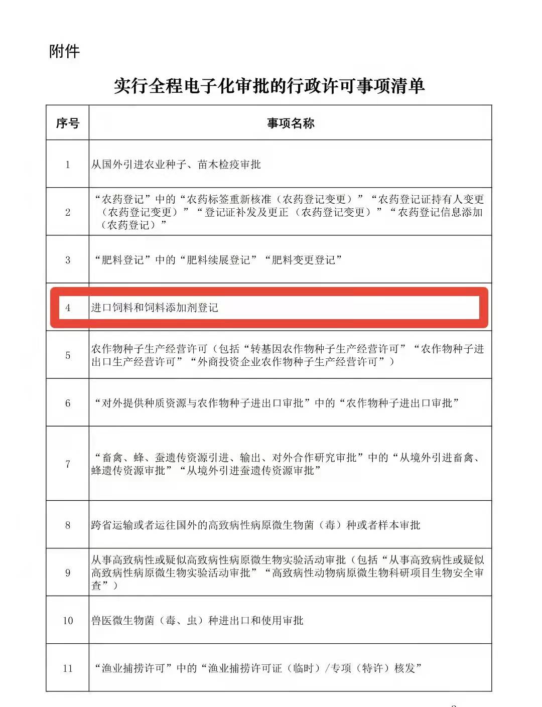 根據(jù)中華人民共和國農(nóng)業(yè)農(nóng)村部公告 第492號顯示,為深入貫徹落實國務(wù)院“放管服”改革精神,提高審批效率、優(yōu)化服務(wù)水平,進(jìn)一步方便行政許可申請人,農(nóng)業(yè)農(nóng)村部決定對“從國外引進(jìn)農(nóng)業(yè)種子、苗木檢疫審批;進(jìn)口飼料和飼料添加劑登記”等11項行政許可事項(含部分子項或許可情形,見附件)實施全程電子化審批。