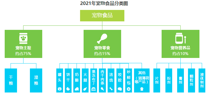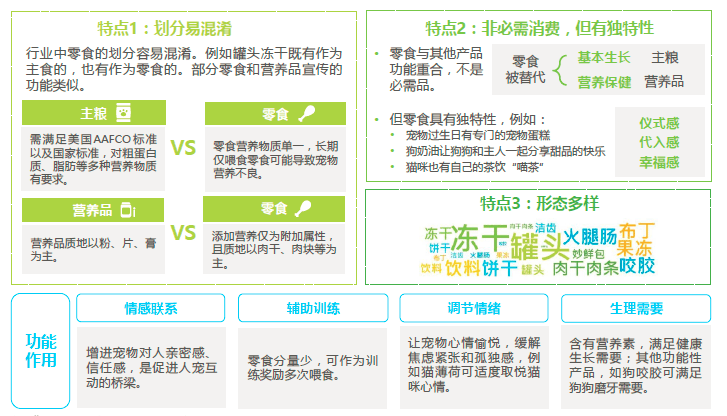 寵物食品是專(zhuān)門(mén)為寵物、小動(dòng)物提供的植物類(lèi)或肉類(lèi)食品,即介于人類(lèi)食品與傳統(tǒng)畜禽飼料之間的動(dòng)物食品。寵物食品以其形態(tài)、功能和營(yíng)養(yǎng)成分可區(qū)分為寵物主食、零食及營(yíng)養(yǎng)品。寵物食品類(lèi)目是目前寵物行業(yè)最大的細(xì)分市場(chǎng),剛需、高頻的消費(fèi)屬性使食品類(lèi)目成為寵物行業(yè)最重要的競(jìng)爭(zhēng)市場(chǎng)。隨著人們對(duì)喂養(yǎng)商品糧的認(rèn)知提升,市場(chǎng)對(duì)寵物食品的需求將進(jìn)一步釋放。