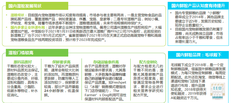 濕糧市場(chǎng)尚未成熟:國(guó)內(nèi)濕糧市場(chǎng)認(rèn)知度仍有待提高,主營(yíng)濕糧的市場(chǎng)參與者較少。賽道高門(mén)檻:濕糧產(chǎn)品對(duì)原料形態(tài)改變小,保鮮要求高,生產(chǎn)工藝運(yùn)輸條件要求高,配方定制化,賽道門(mén)檻較高。精細(xì)化市場(chǎng)易出圈:美國(guó)寵物食品市場(chǎng)集中度較高,仍有Freshpet等濕糧品牌殺出重圍,市值快速增長(zhǎng),依靠的就是濕糧精準(zhǔn)化細(xì)分市場(chǎng)。對(duì)比海外濕糧市場(chǎng)的高滲透率及高增速,中國(guó)市場(chǎng)仍為藍(lán)海,發(fā)展空間廣闊。