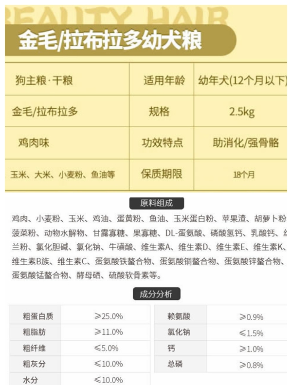 這款犬糧的功效寫著助消化、強(qiáng)骨骼,產(chǎn)品宣傳說助消化的添加劑是維生素復(fù)合物、益生元,原料是易消化蛋白;強(qiáng)骨骼的添加劑是VD3、硫酸軟骨素。
