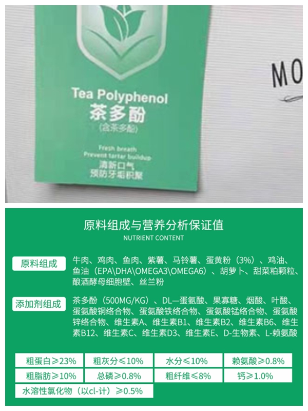 這款犬糧標(biāo)簽中聲稱“含茶多酚,清新口氣,預(yù)防牙垢積聚”,在“添加劑組成”部分,標(biāo)示了茶多酚的添加量,這項功能聲稱合規(guī)。