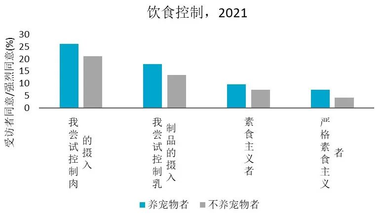 盡管與有機(jī)食品相比,植物基食品所占的份額微不足道,僅占總 SKU 的1%,但考慮到彈性素食主義的火熱,其增長(zhǎng)潛力巨大。盡管全球素食主義者人數(shù)不多,但是大量的消費(fèi)者正嘗試限制其動(dòng)物產(chǎn)品的消費(fèi)(肉的攝入),全球數(shù)量已超20%。此外,寵物主人更有可能選擇素食主義、嚴(yán)格或彈性素食主義的飲食。寵物主的這一趨勢(shì)很有可能會(huì)反映在他們?yōu)閷櫸镞x擇的食品上。