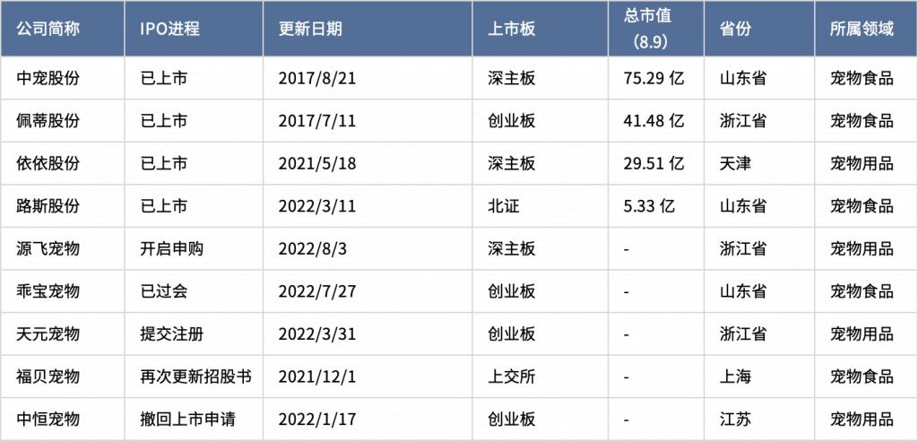 2022 年 8 月 3 日," 狗繩第一股 " 源飛寵物開啟深交所主板上市申購,敲鐘在即;而在不久之前,也就是 7 月 27 日,乖寶寵物創(chuàng)業(yè)板首發(fā)上會(huì)獲得通過,已經(jīng)邁過了 A 股上市最關(guān)鍵的一步;再加上 1 月 14 日順利登陸北交所,成為 " 北交所寵物第一股 " 路斯股份,今年已有三家寵物賽道企業(yè)成功 IPO,而截至目前 A 股寵物領(lǐng)域上市公司也已達(dá)到了 6 家。(有意思的是,這些上市公司中,山東省居然占據(jù)了半壁江山)