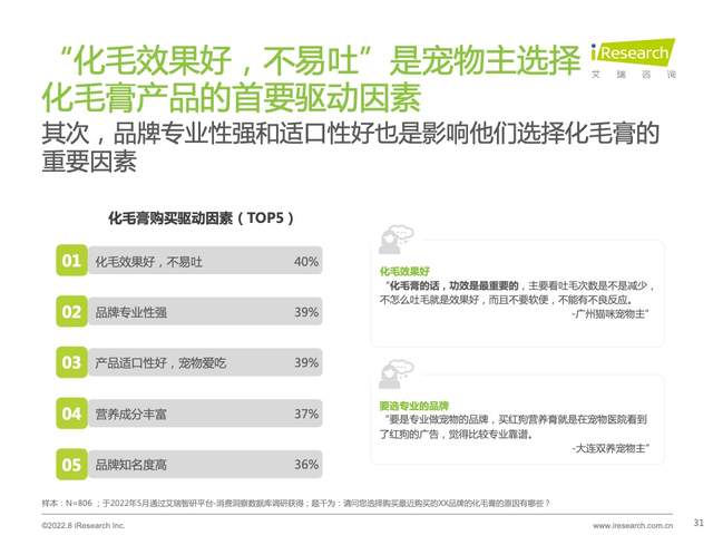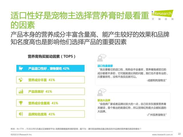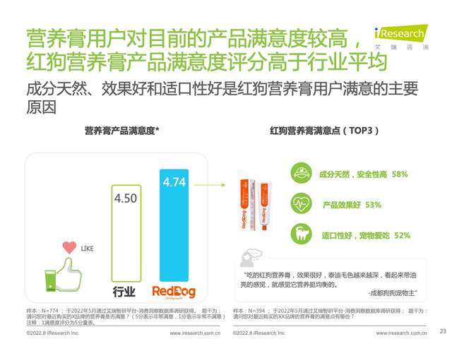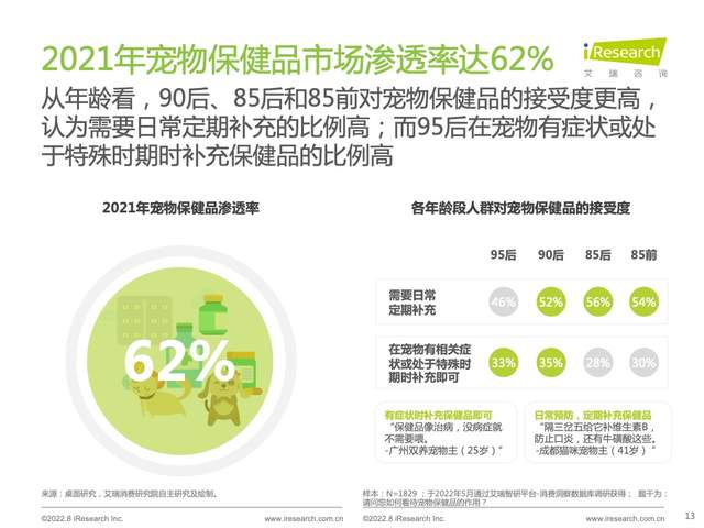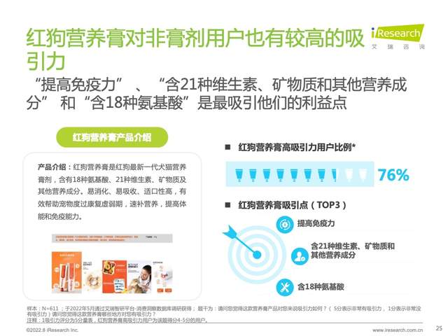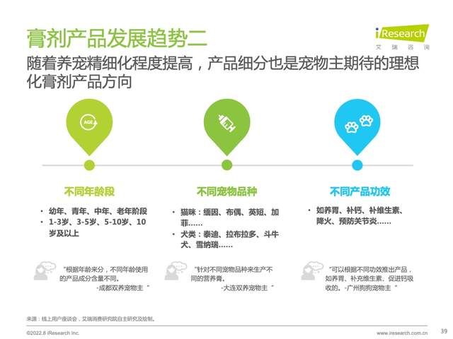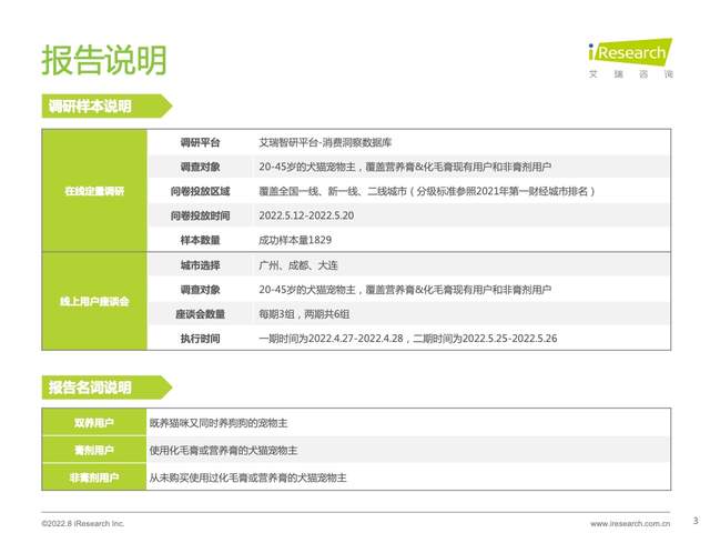 報(bào)告分析了1-2線城市寵物主的養(yǎng)寵偏好以及他們?cè)趯櫸锉=∑飞系南M(fèi)現(xiàn)狀及消費(fèi)態(tài)度;洞察膏劑用戶對(duì)各膏劑保健品品牌產(chǎn)品的體驗(yàn)與評(píng)價(jià)、現(xiàn)有產(chǎn)品的痛點(diǎn)及改進(jìn)建議;同時(shí)對(duì)潛在膏劑用戶的需求及期望進(jìn)行挖掘,了解他們的購(gòu)買阻礙因素及未來嘗試動(dòng)機(jī);從寵物主的需求與現(xiàn)有痛點(diǎn)出發(fā),探索寵物膏劑保健品未來的發(fā)展趨勢(shì)。
