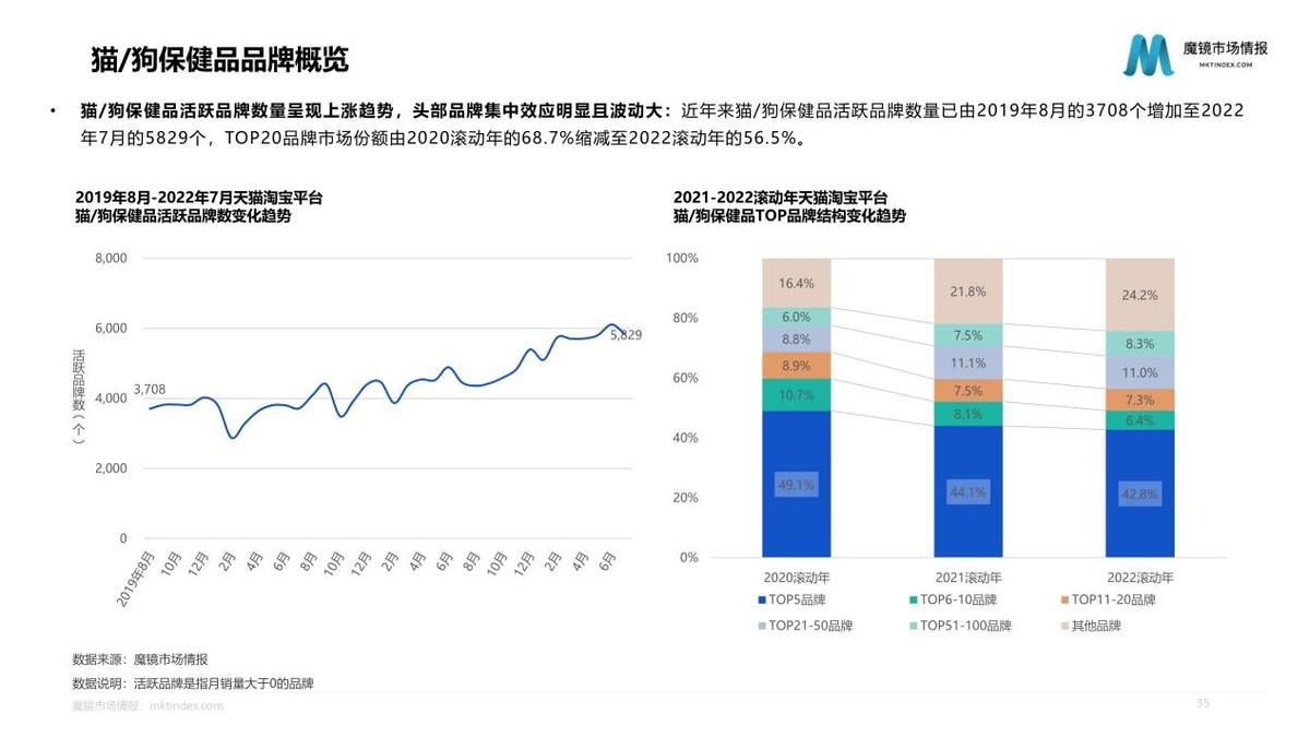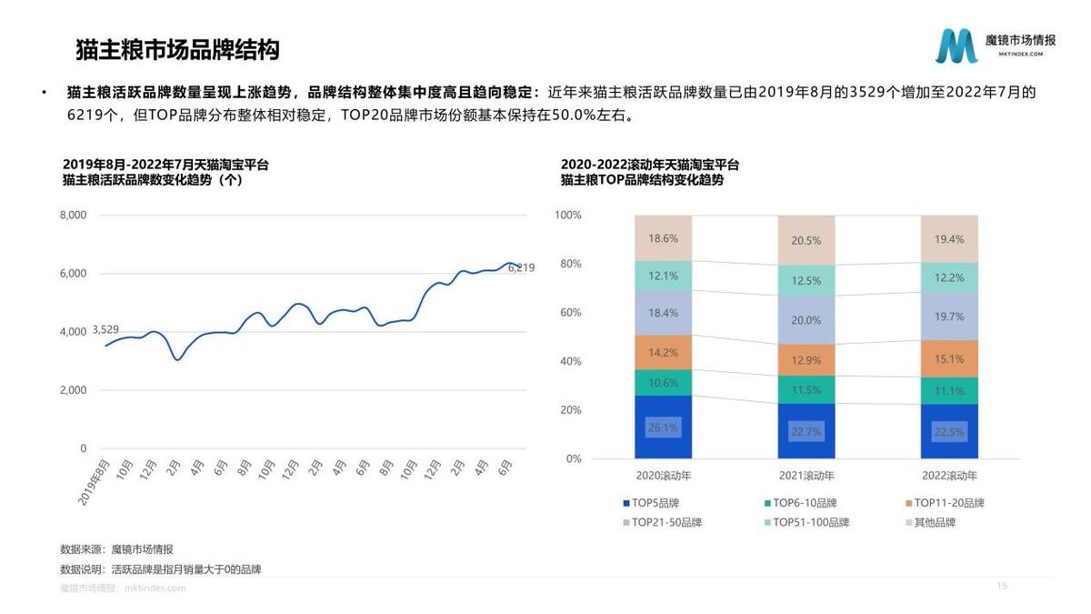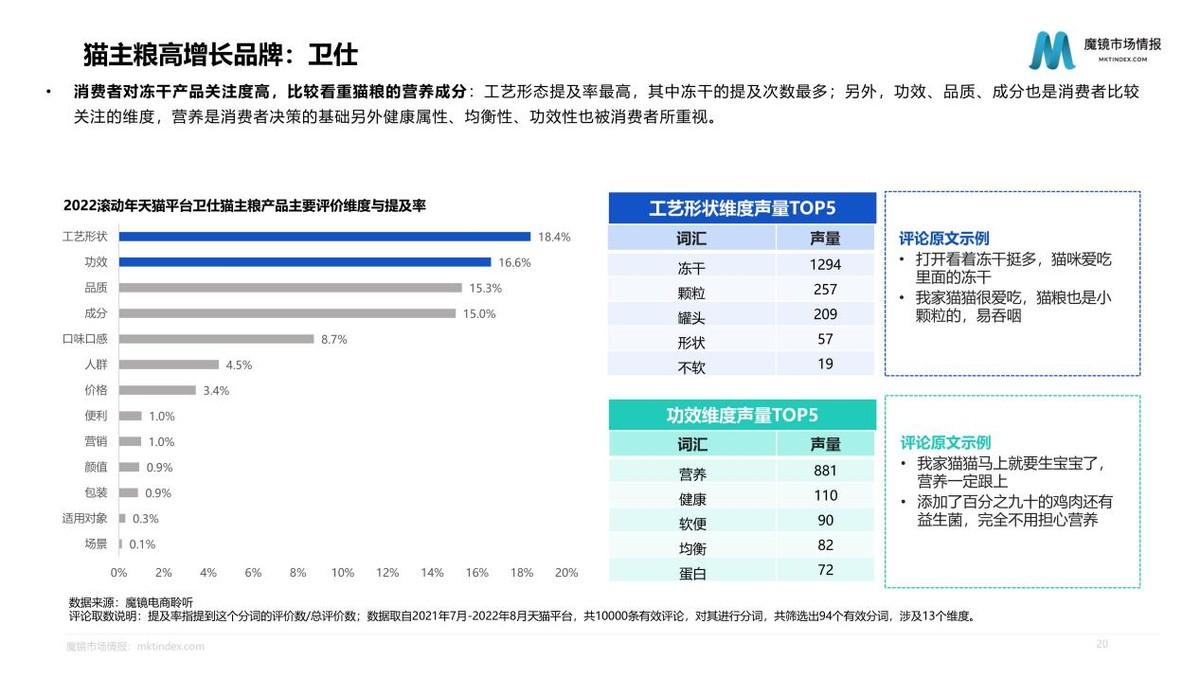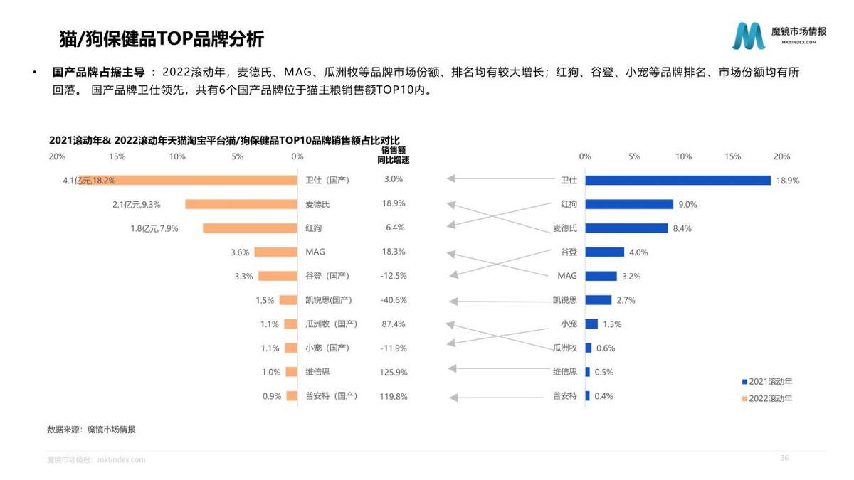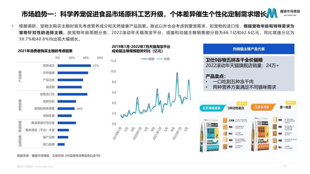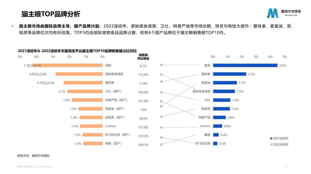 深入分析市場產(chǎn)品發(fā)現(xiàn),無谷、雞肉、天然鮮肉等成分概念占據(jù)主流,生骨肉、雙拼等成分概念增速明顯;凍干工藝占據(jù)主流,濕糧、低溫烘焙等概念增速明顯;增肥發(fā)腮、營養(yǎng)功效概念占據(jù)主導;成貓、幼貓是最主流的區(qū)分類型,專用概念增速明顯。2022滾動年,原始獵食渴望、衛(wèi)仕等市場份額、排名均有較大提升;TOP3仍由國際寵物食品品牌占據(jù),但有6個國產(chǎn)品牌位于貓主糧銷售額TOP10內(nèi)。