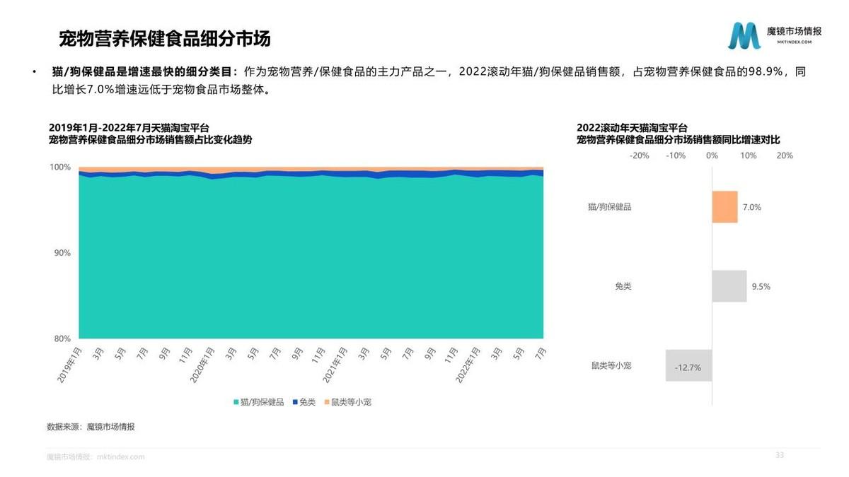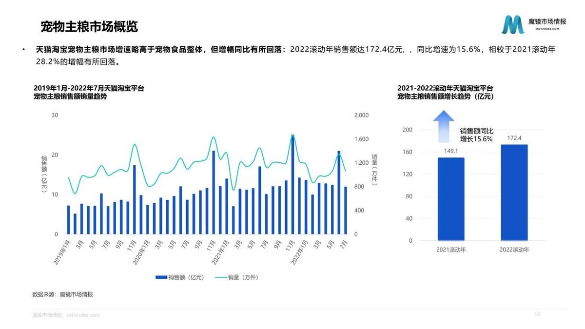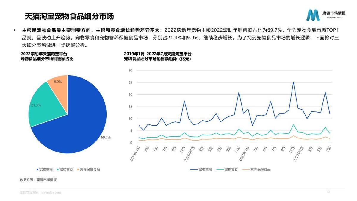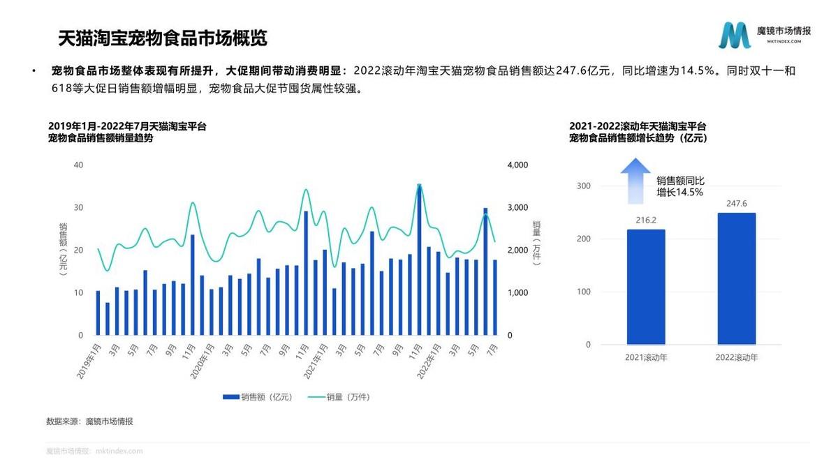 線上渠道成為寵物食品消費的重要方式,線上寵物食品銷售額占比由2010年的1.2%增長至2018年的45.4%。2022滾動年天貓?zhí)詫殞櫸锸称蜂N售額達247.6億元,同比增速為14.5%。寵物主糧作為寵物食品市場TOP1品類,呈波動上升趨勢,寵物零食和寵物營養(yǎng)保健食品市場繼續(xù)穩(wěn)步增長。