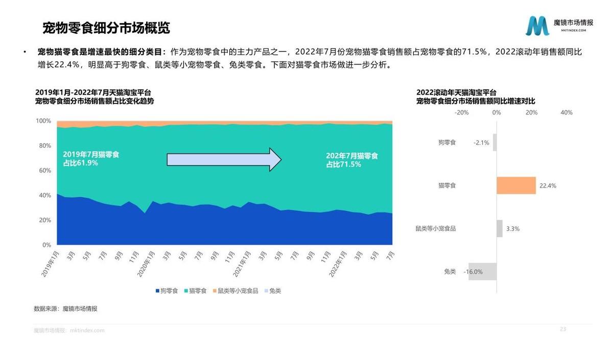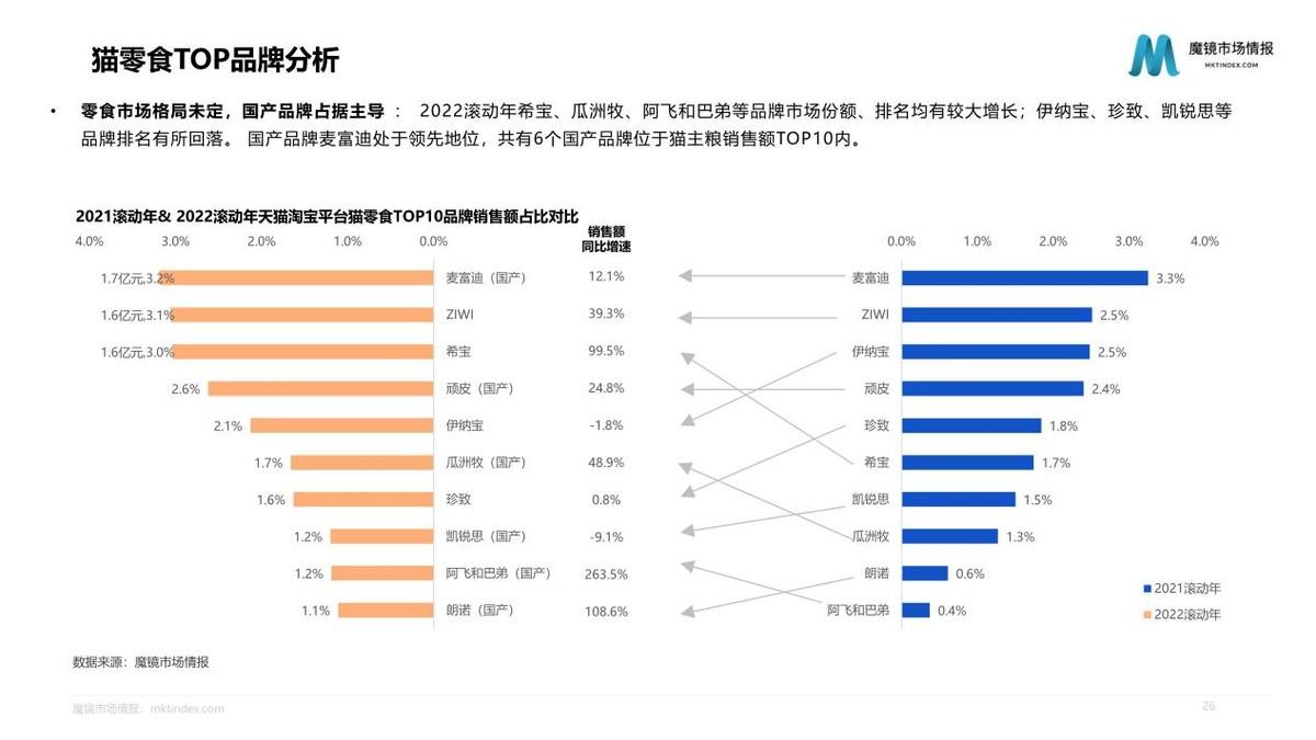 2022滾動年天貓?zhí)詫殞櫸锪闶充N售額達52.8億元,同比增速為14.2%,市場增速略低于寵物食品整體。但占比為71.5%的貓零食市場,增速達22.4%,明顯高于狗零食、鼠類等小寵物零食、兔類零食。2022滾動年希寶、瓜洲牧、阿飛和巴弟等品牌市場份額、排名均有較大增長;國產(chǎn)品牌麥富迪處于領先地位,共有6個國產(chǎn)品牌位于貓主糧銷售額TOP10內(nèi)。