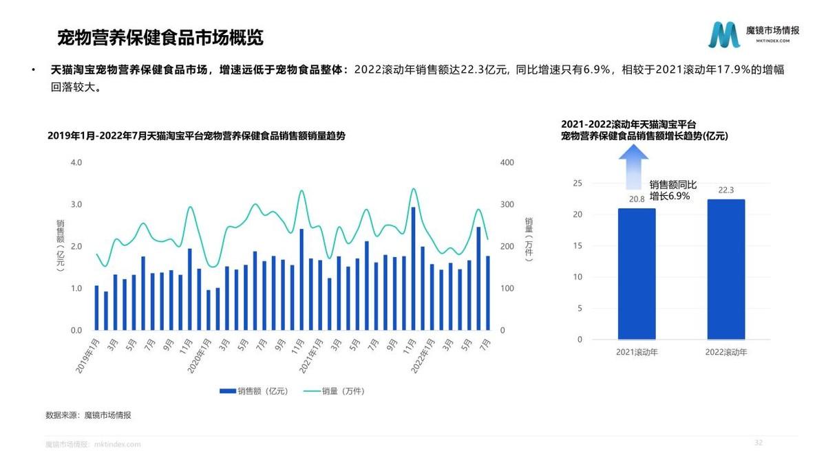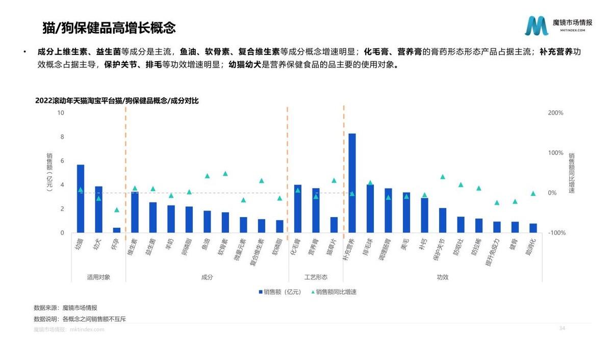 寵物營養(yǎng)保健食品市場,增速遠低于寵物食品整體,2022滾動年銷售額達22.3億元, 同比增速只有6.9%,相較于2021滾動年17.9%的增幅回落較大。對寵物營養(yǎng)保健食品市場產(chǎn)品深入分析發(fā)現(xiàn),成分上維生素、益生菌等成分是主流,魚油、軟骨素、復合維生素等成分概念增速明顯;化毛膏、營養(yǎng)膏的膏狀形態(tài)產(chǎn)品占據(jù)主流;補充營養(yǎng)功效概念占據(jù)主導,保護關節(jié)、排毛等功效增速明顯;幼貓幼犬是營養(yǎng)保健品主要的使用對象。寵物營養(yǎng)品作為寵物食品的補充,迎合了寵物消費升級的需求,也越來越精細化、多樣化。