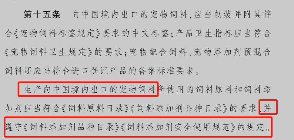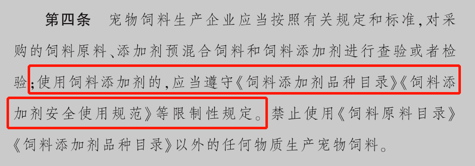 在我國境內(nèi)生產(chǎn)、銷售的寵物飼料,所使用的添加劑必須是已經(jīng)被登記注冊到《飼料添加劑目錄》中的物質(zhì),且針對每一個批準(zhǔn)的飼料添加劑產(chǎn)品都需要符合國家規(guī)定的相關(guān)產(chǎn)品標(biāo)準(zhǔn),從而保障了純品飼料添加劑的質(zhì)量安全。并且對于飼料添加劑的使用量及使用范圍也是要滿足《飼料添加劑安全使用規(guī)范》的要求,上述規(guī)定在農(nóng)業(yè)部20號公告的《寵物飼料管理辦法》第四條和第十五條中都有明確指出: