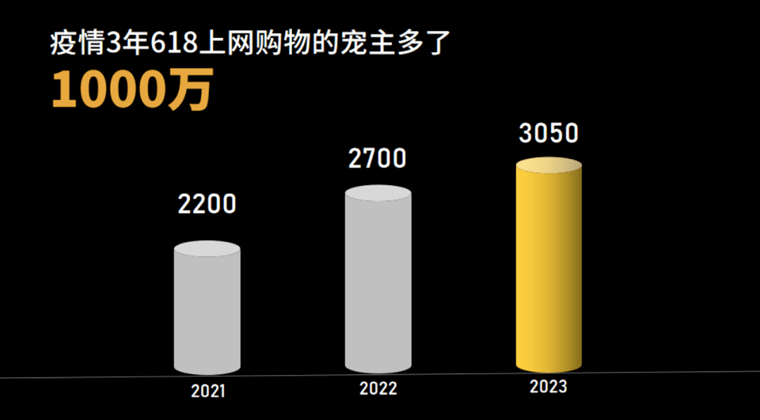 根據(jù)過去三年(2021—2023年)監(jiān)測618年中大促的結(jié)果顯示,618網(wǎng)上購物的寵主越來越多,在2021年,線上主流電商平臺(天貓、京東、抖音、快手)有將寵物產(chǎn)品加到購物車的用戶總數(shù)為2200萬人,2022年的用戶總數(shù)為2700萬人,到2023年這些用戶數(shù)量達到了3050萬,相比2021年多了超800萬新用戶。
