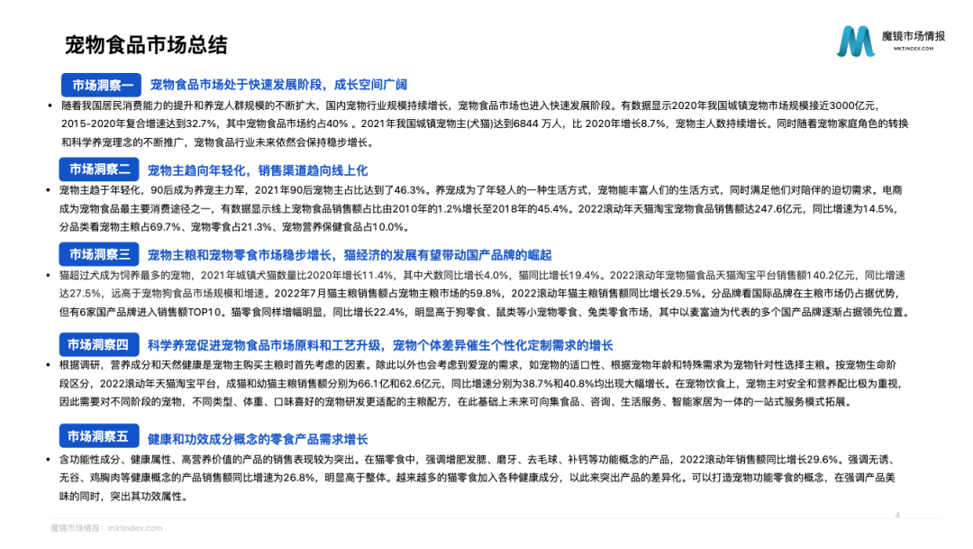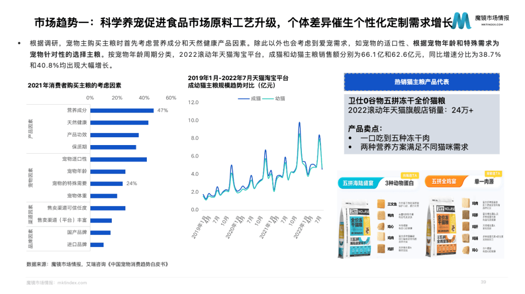 魔鏡通過分析國內(nèi)電商平臺(天貓?zhí)詫?京東)的寵物市場數(shù)據(jù),洞察到國內(nèi)寵物食品賽道的2個大趨勢: