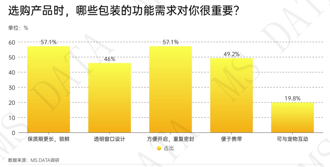 對于寵物食品包裝,調(diào)研結(jié)果顯示,57.15%的消費(fèi)者認(rèn)為保質(zhì)期更長、鎖鮮、方便開啟和重復(fù)密封是最重要的;其次是便于攜帶以及透明窗口設(shè)計(jì)。