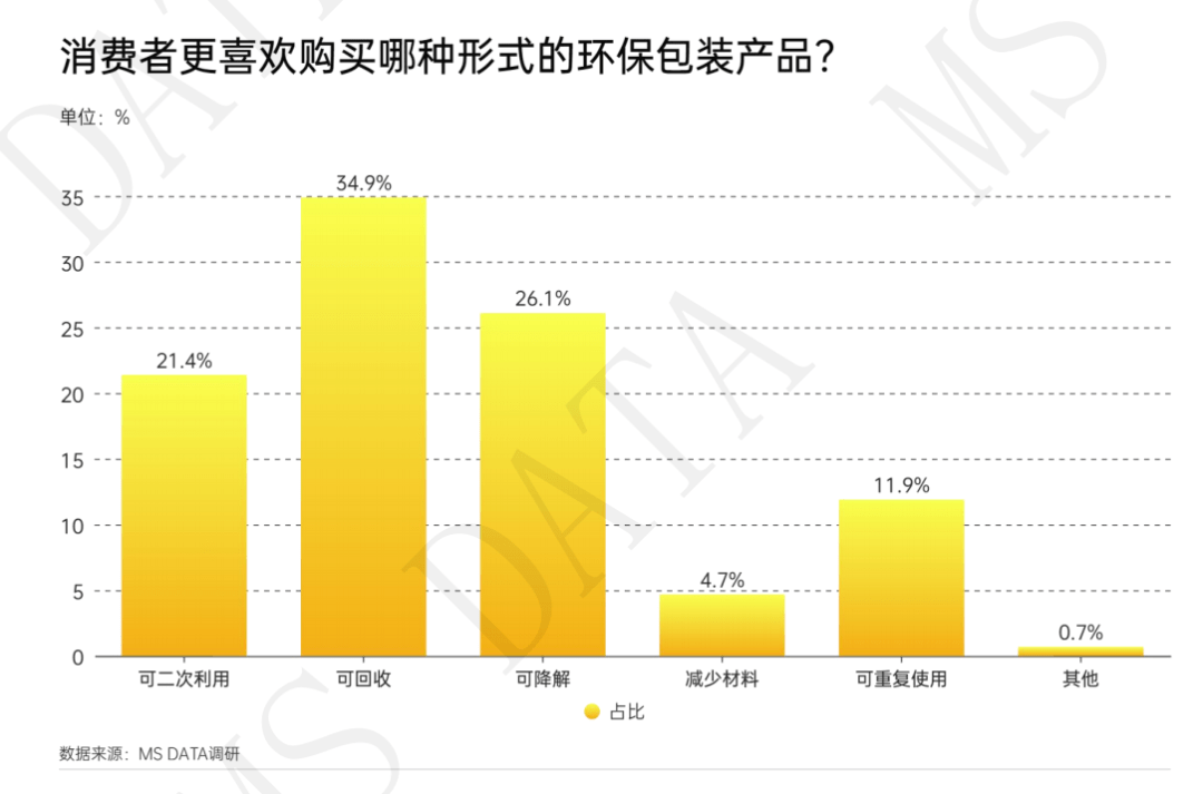 對于綠色可持續(xù)的包裝,有73.95%的消費(fèi)者愿意支付一定費(fèi)用來購買環(huán)保包裝產(chǎn)品,34.9%的消費(fèi)者更喜歡購買可回收的包裝,其次是可降解的包裝,占比為26.1%,減少材料的包裝占比最少,為4.7%。