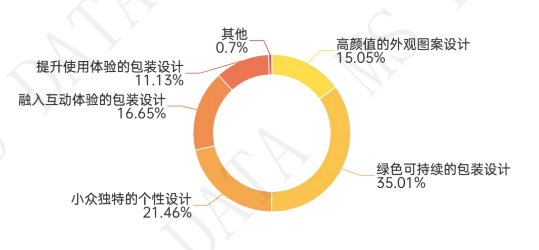 此外,調(diào)研數(shù)據(jù)還顯示,綠色可持續(xù)的包裝設(shè)計(jì)更能吸引消費(fèi)者進(jìn)行購買,占比為35.01%;其次是小眾獨(dú)特的個(gè)性設(shè)計(jì),占比為21.46%,16.65%的消費(fèi)者最關(guān)注融入互動體驗(yàn)的包裝設(shè)計(jì)。