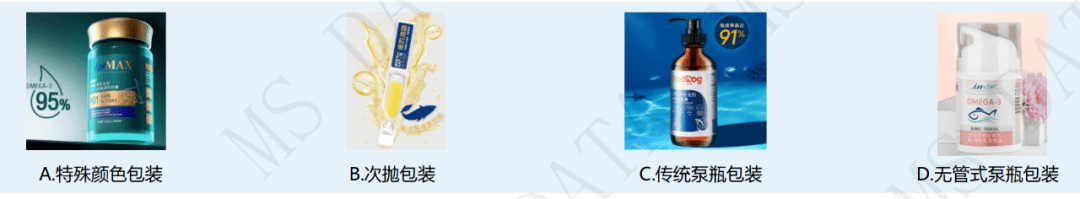 寵物用魚油產(chǎn)品常見的包裝有特殊顏色包裝、次拋包裝、傳統(tǒng)泵瓶包裝、無管式泵瓶包裝。據(jù)調(diào)研數(shù)據(jù)顯示,消費(fèi)者選擇特殊顏色包裝比較多,這是一款特殊顏色的寵物魚油產(chǎn)品。該產(chǎn)品采用了更加鮮艷的顏色包裝,并且?guī)в幸姿豪瓑|片,方便開啟。