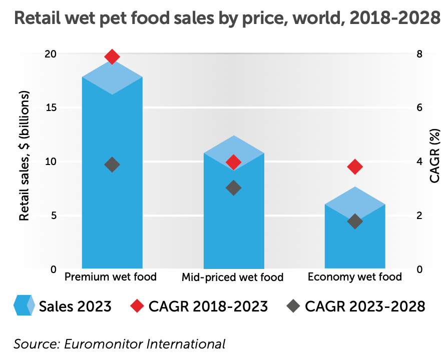 預(yù)計(jì)在未來5年內(nèi),高端寵物食品仍將是增長(zhǎng)最快的細(xì)分市場(chǎng),但增速將遠(yuǎn)低于過去。根據(jù)消除通脹影響的不變價(jià)格計(jì)算,預(yù)計(jì)高檔濕寵物食品的復(fù)合年增長(zhǎng)率(CAGR)為3.8%,而中檔和經(jīng)濟(jì)型寵物食品的復(fù)合年增長(zhǎng)率分別為2.9%和1.8%。