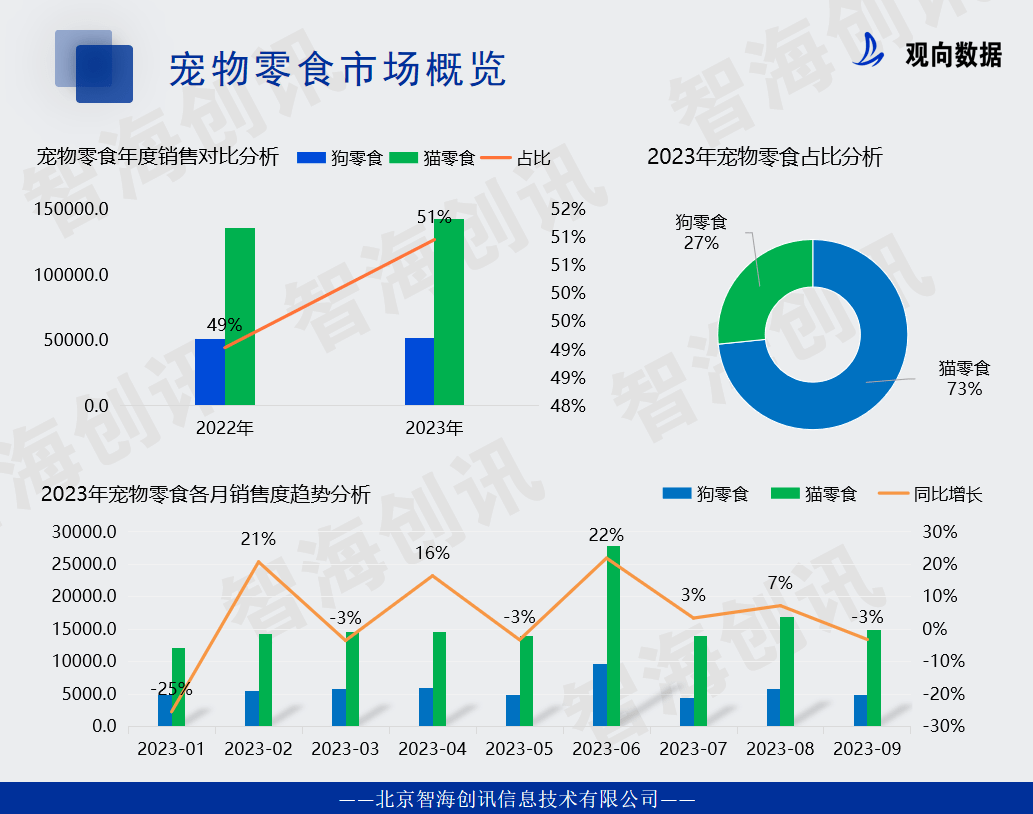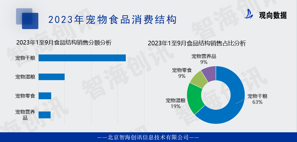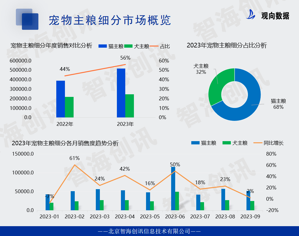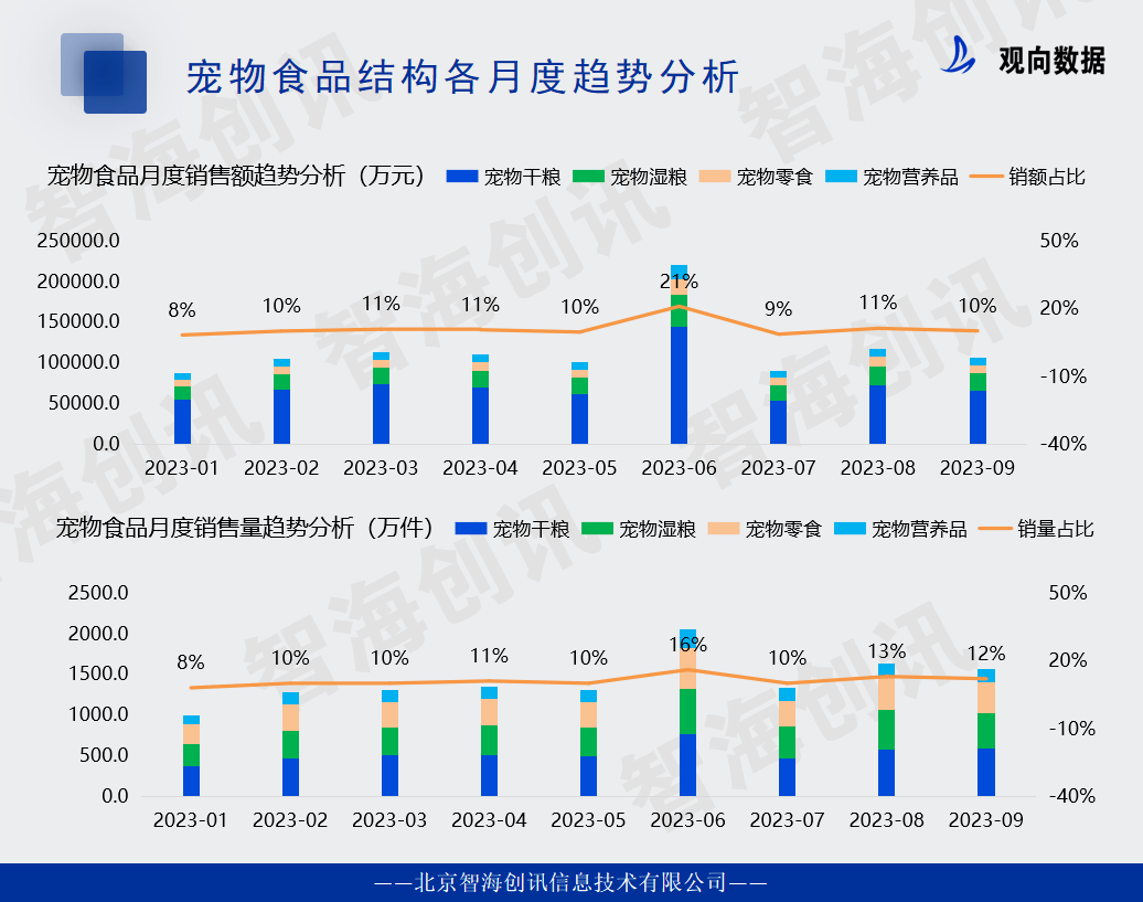 據(jù)統(tǒng)計(jì)數(shù)據(jù)顯示,2023年1~9月,寵物食品結(jié)構(gòu)市場(chǎng)趨勢(shì)分析,銷(xiāo)售最高的為6月銷(xiāo)售額占比21%,銷(xiāo)售量占比16%。從數(shù)據(jù)上來(lái)看,每個(gè)月的銷(xiāo)售相對(duì)均衡,這表明寵物食品市場(chǎng)的銷(xiāo)售呈現(xiàn)出了穩(wěn)定的態(tài)勢(shì)。這種持續(xù)的銷(xiāo)售趨勢(shì)可能由多種原因所引起。首先,寵物食品是寵物主人們的必備品,而隨著人們對(duì)寵物健康和福利的關(guān)注度不斷提高,他們更愿意投入資金購(gòu)買(mǎi)高質(zhì)量的寵物食品,從而推動(dòng)了市場(chǎng)的穩(wěn)定增長(zhǎng)。