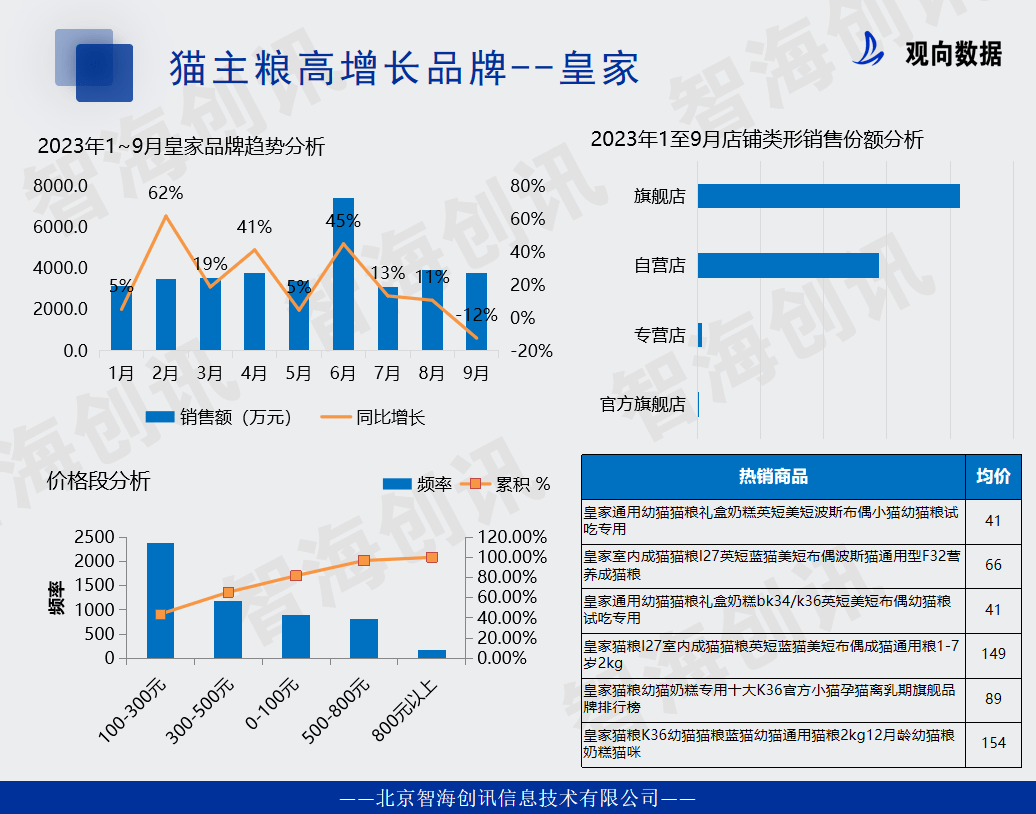 根據(jù)數(shù)據(jù)顯示,皇家品牌2023年1~9月銷(xiāo)售主要集中在6月,同比去年增長(zhǎng)45%,這與618大促有一定的關(guān)系。從店鋪類(lèi)型來(lái)看,銷(xiāo)售主要集中在旗艦店占比59%;從價(jià)格段來(lái)看銷(xiāo)售主要集中在100~300元之間。