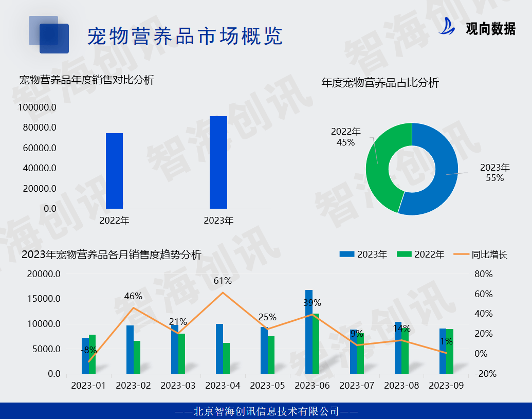 寵物營(yíng)養(yǎng)品則用于為挑食、體弱或年老的寵物補(bǔ)充維生素、礦物質(zhì)等微量元素。據(jù)數(shù)據(jù)顯示,寵物營(yíng)養(yǎng)品銷(xiāo)售比較均衡,2023年同比去年增長(zhǎng)22%。