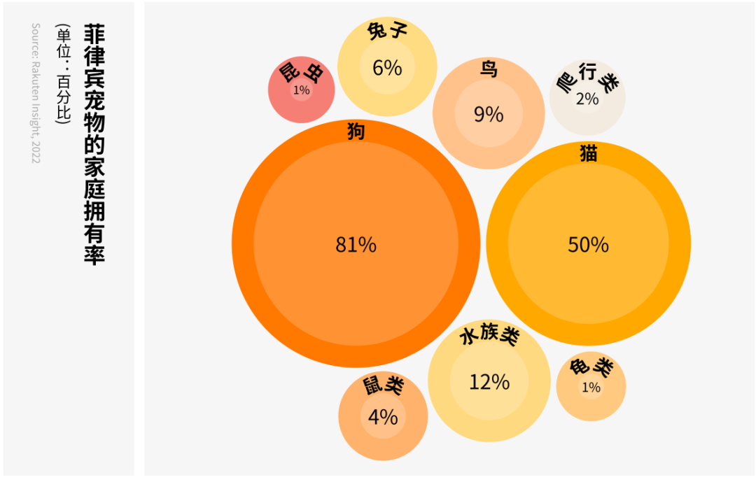 在寵物家庭擁有率上,貓和狗在當?shù)仞B(yǎng)寵占比最大,分別為60%和36%。其次是水族類(25%)、兔子(7%)和鳥類(7%)。