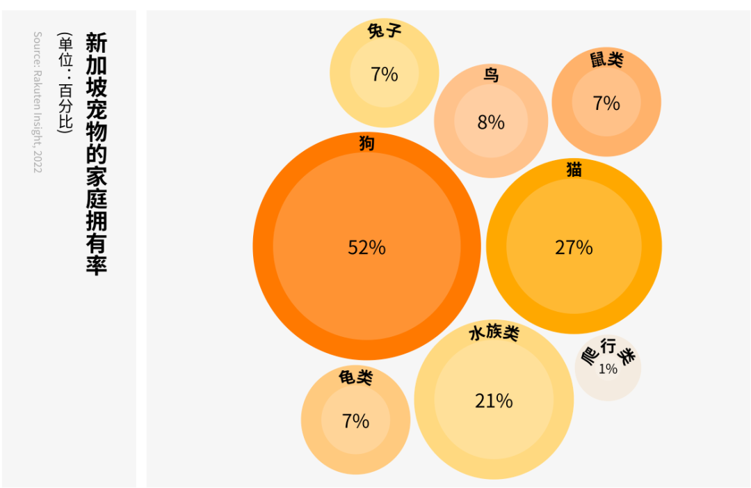 在寵物數(shù)量方面,過去5年,新加坡每年的寵物擁有量增長了3%,寵物狗在新加坡較受歡迎,其次為貓和水族類。新加坡寵物犬的家庭擁有率在52%,寵物貓為27%、其次是水族(21%)、鳥類(8%)。