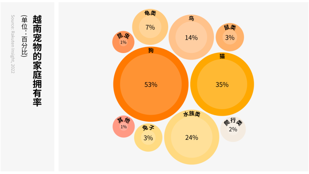 在寵物家庭擁有率上,越南寵物犬為53%、寵物貓為35%,其次是水族類(24%)、鳥類(14%)。