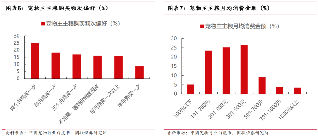 寵主購買主糧形成定期囤貨行為,寵主月消費(fèi)仍以中低端為主。