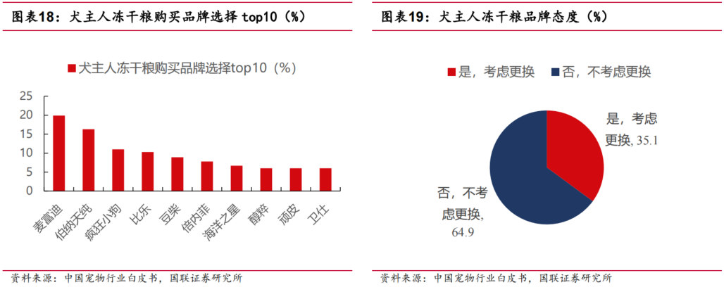 犬主人凍干糧偏好前三的品牌分別為麥富迪、伯納天純、瘋狂小狗,貓主人凍干糧偏好前三的品牌分別為網(wǎng)易嚴(yán)選、麥富迪、阿飛和巴弟,除伯納天純?yōu)閲H品牌國內(nèi)生產(chǎn)外,其余品牌均為國內(nèi)自主生產(chǎn)品牌,凍干糧領(lǐng)域國產(chǎn)品牌受歡迎程度進(jìn)一步提升。