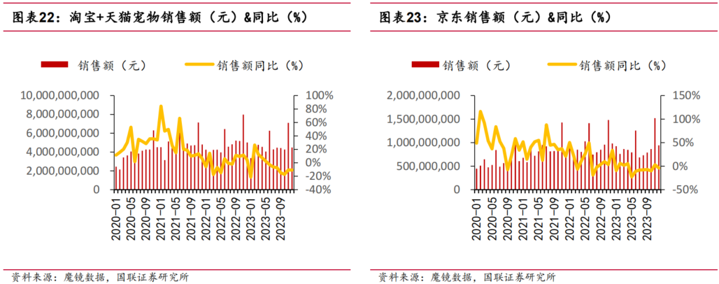 傳統(tǒng)電商天貓?zhí)詫殹⒕〇|銷售同比出現(xiàn)下降,新興渠道抖音呈現(xiàn)高增速,新渠道或成寵物市場主要競爭點。