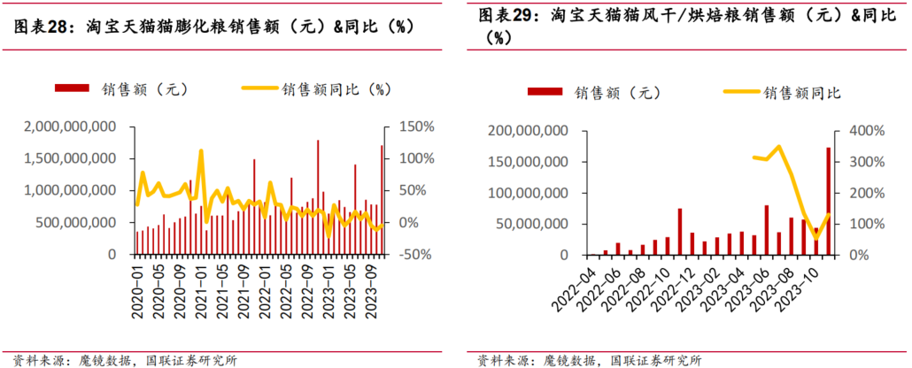 2023年12月份,淘寶天貓貓膨化糧、風(fēng)干/烘焙糧、凍干糧銷售額分別為7.74/0.54/0.42億元,同比-21.30%/+47.61%/+38.17%,銷量同比167.23%/+125.87%/+50.55%。