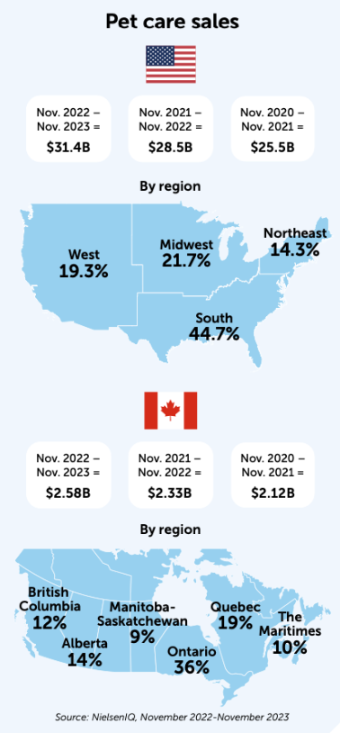 2022年11月至2023年11月,加拿大的寵物行業(yè)零售額為25億美元,寵物產(chǎn)品銷量超3.77億。同期相比,銷售額增長(zhǎng)了11%,寵物產(chǎn)品銷量下降了1%。可以看到,美加兩國(guó)寵物行業(yè)銷售額正在大幅增長(zhǎng),而單位銷量則持平或下降。加拿大的寵物產(chǎn)品平均單價(jià),從6.03美元上漲至6.79美元,上漲了13%。Alberta是寵物產(chǎn)品平均單價(jià)最高的地區(qū),為8.34美元,其次是 Manitoba- Saskatchewan(8.10美元)、安大略?。?.66美元),Maritimes(6.34美元),魁北克省(6.33美元)和不列顛哥倫比亞?。?.32美元)。