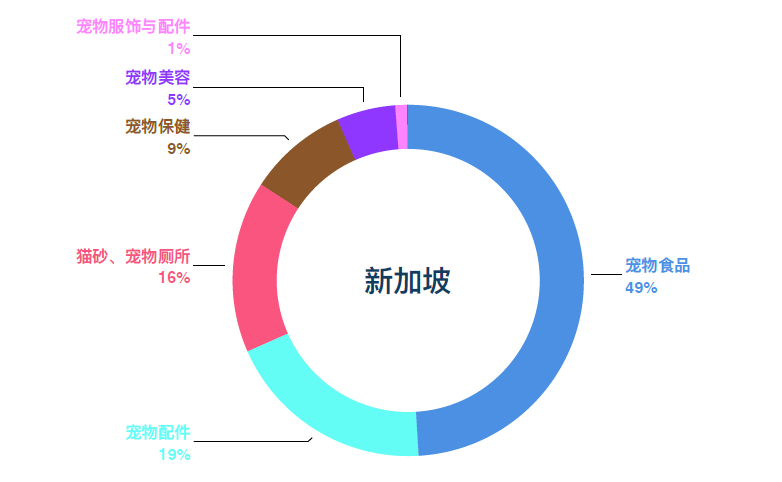 泰國(guó)和印度尼?亞是東南亞六國(guó)最?的兩個(gè)寵物市場(chǎng),銷售額分別約為1693萬(wàn)和1666萬(wàn)美元,分別占所有市場(chǎng)的四分之?,養(yǎng)寵需求旺盛。新加坡因相對(duì)嚴(yán)格的養(yǎng)寵政策,市場(chǎng)規(guī)模最小,約為479萬(wàn)美元。
