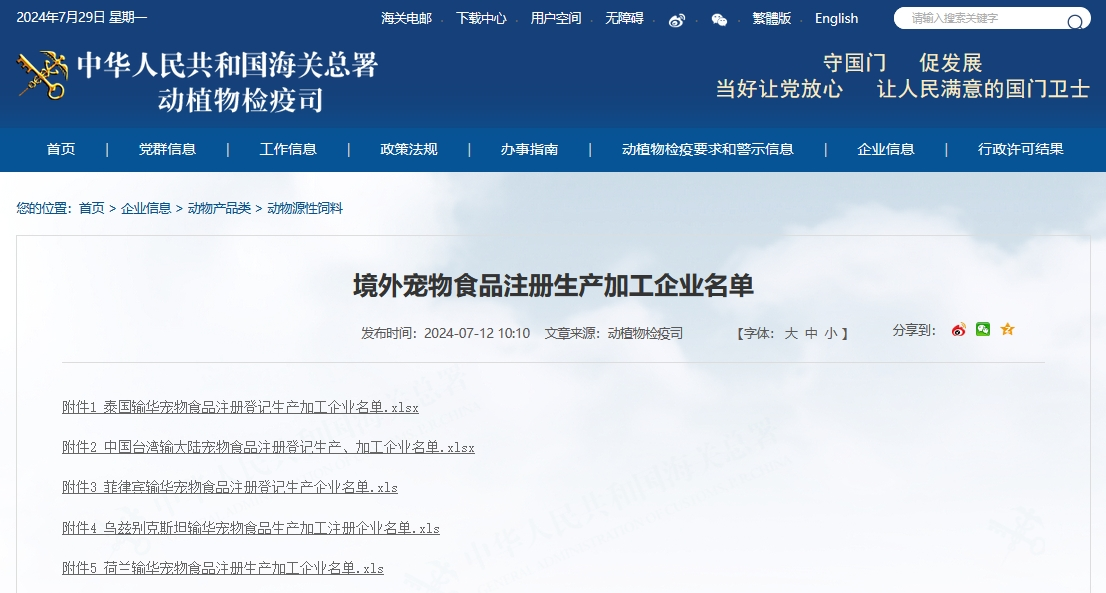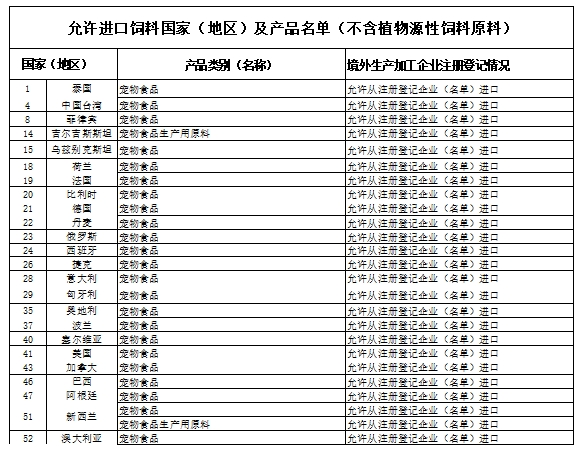 目前,已有泰國(guó)、中國(guó)臺(tái)灣、菲律賓、吉爾吉斯坦、烏茲別克斯坦、荷蘭、法國(guó)、比利時(shí)、德國(guó)、丹麥、西班牙、捷克、意大利、奧地利、美國(guó)、加拿大、巴西、阿根廷、新西蘭、澳大利亞、波蘭等國(guó)家或地區(qū)的寵物食品獲得準(zhǔn)入。
