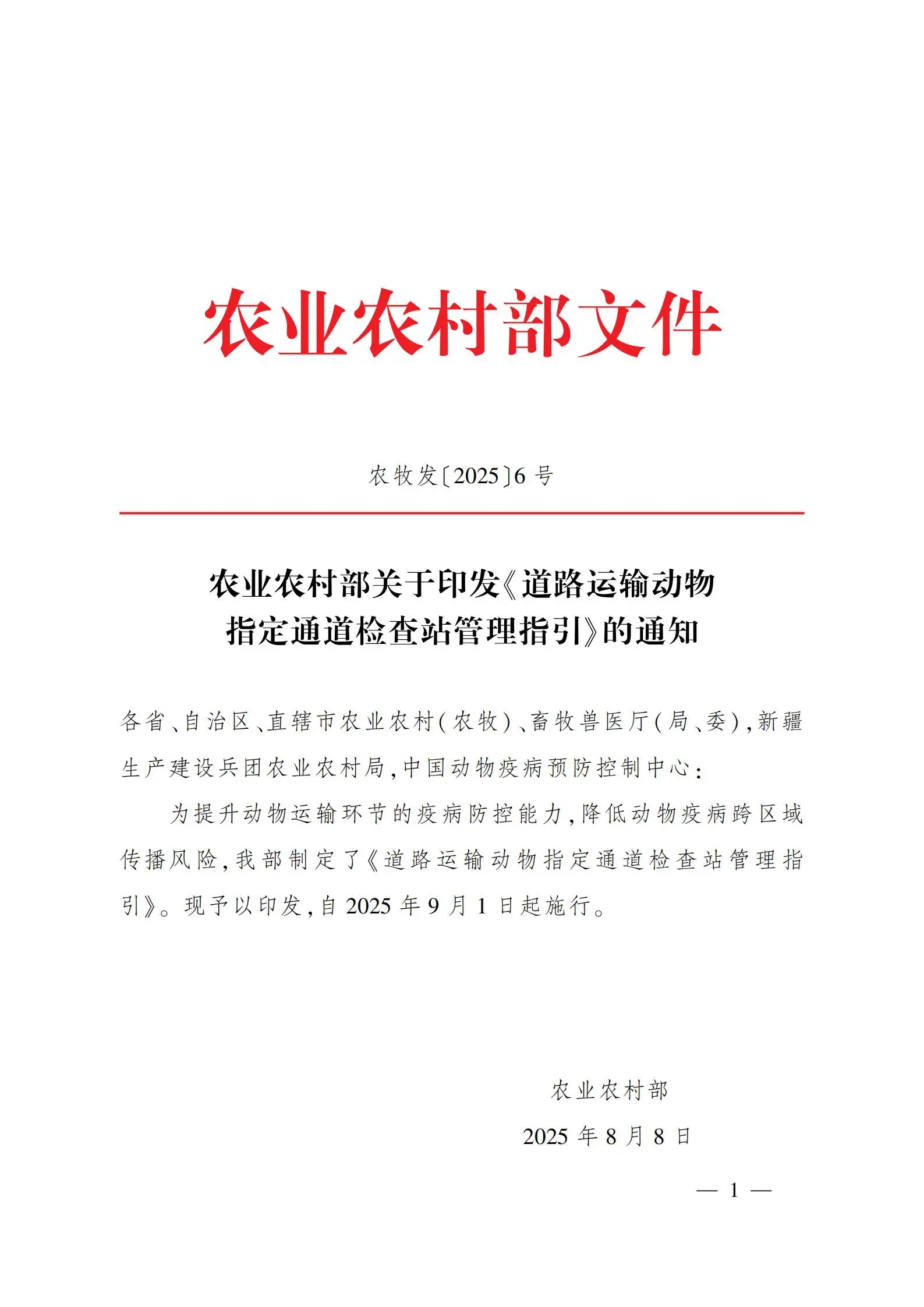 為提升動物運輸環(huán)節(jié)的疫病防控能力,降低動物疫病跨區(qū)域傳播風險,農(nóng)業(yè)農(nóng)村部制定了《道路運輸動物指定通道檢查站管理指引》,該指引將于2025年9月1日起施行。