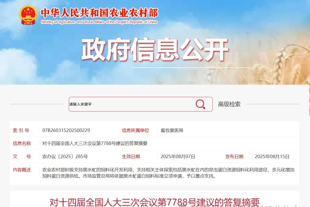 近日,農(nóng)業(yè)農(nóng)村部回復(fù)十四屆全國(guó)人大三次會(huì)議第7788號(hào)關(guān)于加快構(gòu)建黑水虻研究與應(yīng)用體系替代進(jìn)口大豆的建議。全文如下: