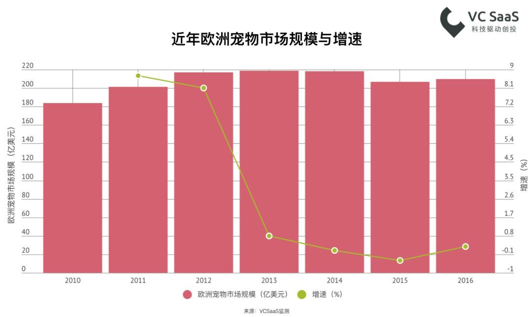 歐洲寵物市場經(jīng)濟(jì)總提規(guī)模甚至從2013年開始出現(xiàn)了連續(xù)兩年的下跌,最近連續(xù)5年的市場規(guī)??偭慷急3衷?00——220億美元之間。