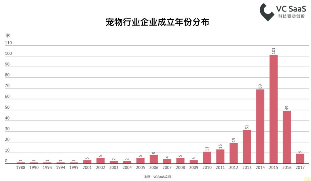 根據(jù)VC SaaS監(jiān)測的389家企業(yè)來看,從2013年開始至2015年,寵物行業(yè)的新注冊企業(yè)數(shù)量開始有了一個(gè)爆發(fā),標(biāo)志著寵物行業(yè)的競爭格局已打開,越來越多的創(chuàng)業(yè)者入局。